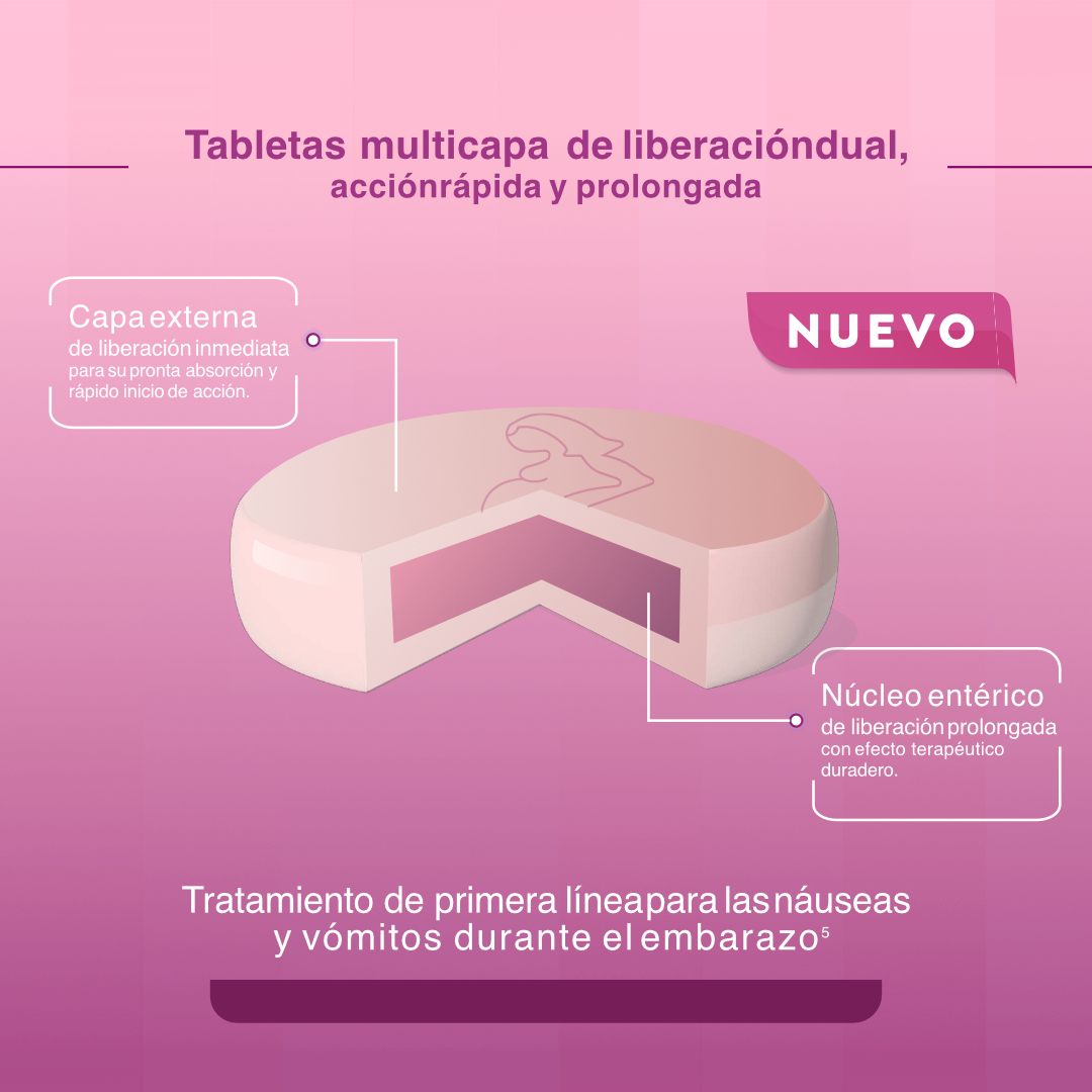 Las tabletas de liberación prolongada de Bonjesta® están diseñadas para ofrecer un alivio rápido y continuo de los síntomas de las náuseas matutinas durante todo el día y la noche.